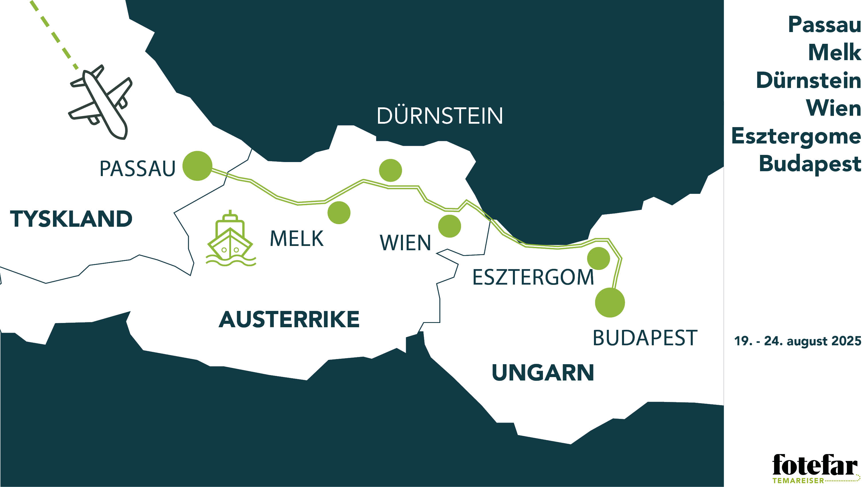 Cruiset tek oss med til seks byar og tre land – Tyskland, Austerrike og Ungarn. Vi startar i Passau i Tyskland og går så til Melk, Durnstein og Wien i Austerrike. Deretter seglar vi vidare til Esztergom og Budapest i Ungarn. På vegen får vi oppleve det storslegne Schönbrunn-palasset og den vakre Wachau-dalen som er på UNESCO si verdsarvsliste. I tillegg får vi sjå Dürnstein-slottet som ligg i området som mange reknar som det vakraste langs Donau med sine skogkledde åsar, frukthagar, småe landsbyar, vinmarker og kloster. Høgdepunkta blir likevel kanskje dei to gamle kulturbyane og hovudstadene, Wien og Budapest.